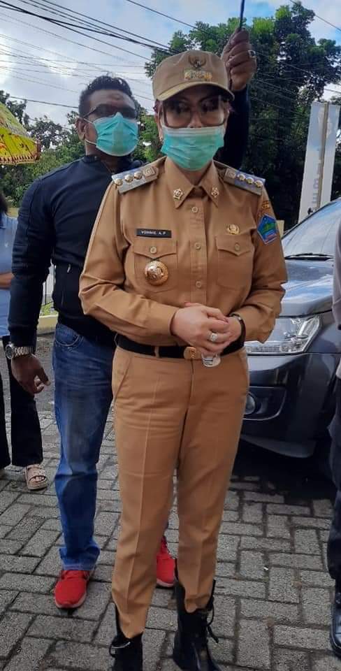 Bupati Kabupaten Minut, DR (HC) Vonnie Anneke Panambunan STh (VAP), turut menghadiri dan mendoakan agar pelaksanaan kegiatan penyemprotan desinfektan tersebut berjalan lancar dalam mencegah penyebaran Covid-19 di Minut.