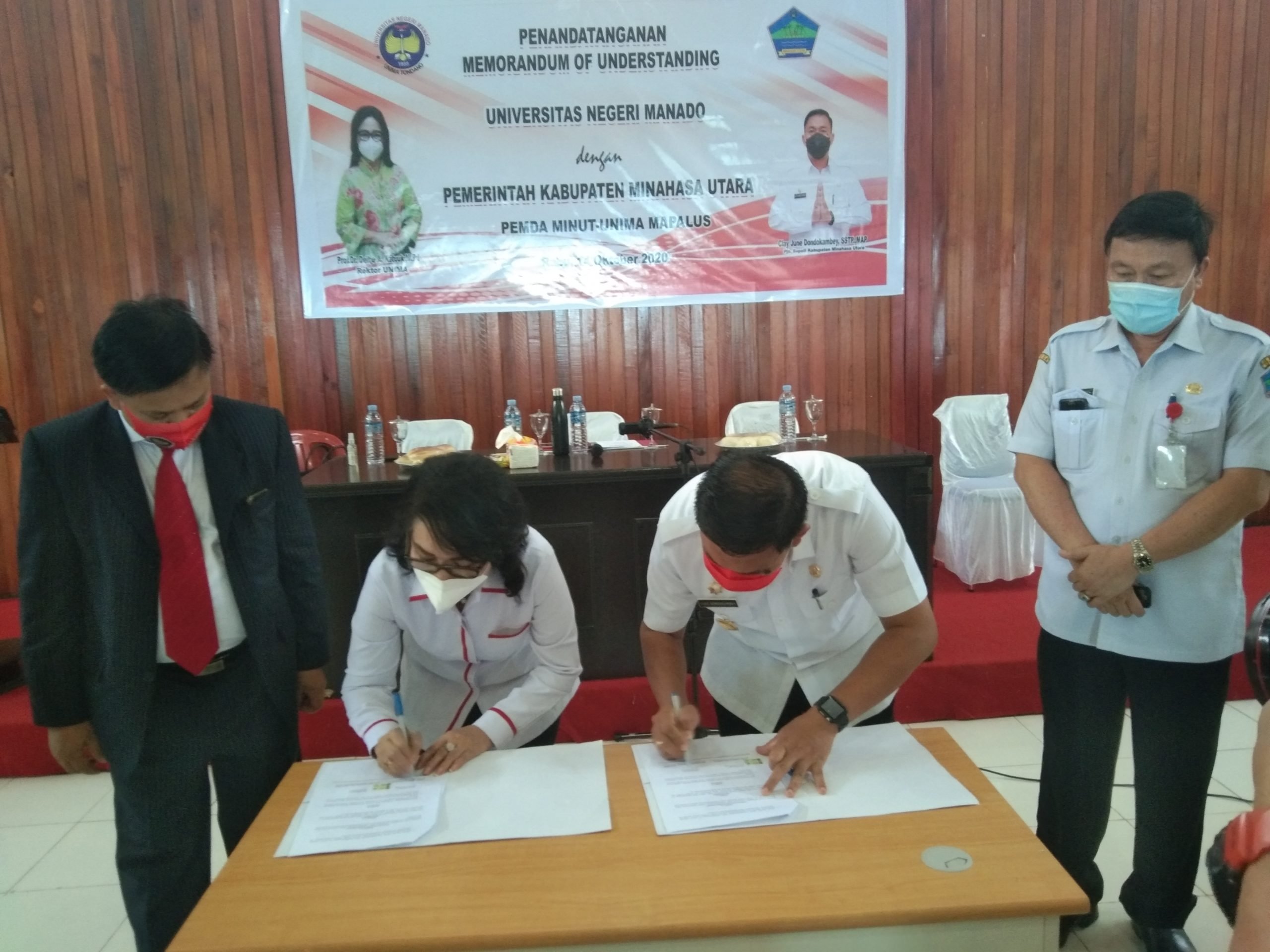 MINUT, sulutexpress.com – Pemerintah Kabupaten (Pemkab) Minahasa Utara (Minut) bersama Universitas Negeri Manado (Unima) melakukan penandatanganan nota kesepahaman Memorandum of Understanding (MoU) dan penandatanganan nota perjanjian Memorandum of Agreement (MoA), Rabu (18/10/2020) di kantor Bupati.