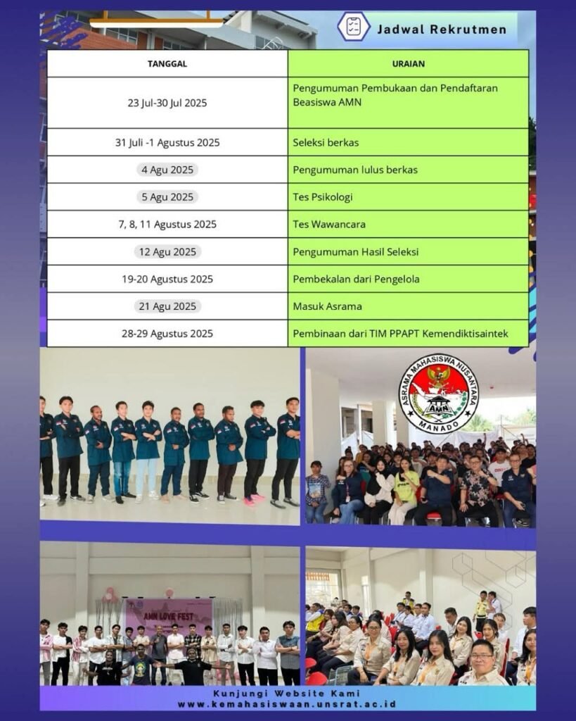 Bagi yang berminat, segera siapkan dokumen dan tunjukkan kemampuan terbaikmu untuk menjadi bagian dari generasi penerima manfaat beasiswa AMN di UNSRAT Manado tahun 2025.