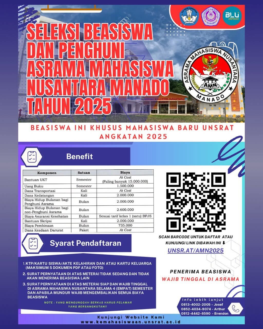 UNSRAT Resmi Buka Pendaftaran Beasiswa dan Penghuni AMN Tahun 2025