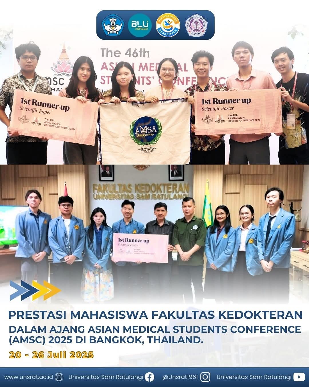Manado, sulutexpress.com, Senin (22/09/2025) –Tim Mahasiswa Fakultas Kedokteran (FK) UNSRAT Manado, berhasil menorehkan prestasi di ajang Asian Medical Students Conferenc (AMSC) 2025 di Bangkok, Thailand 20-26 Juli lalu.