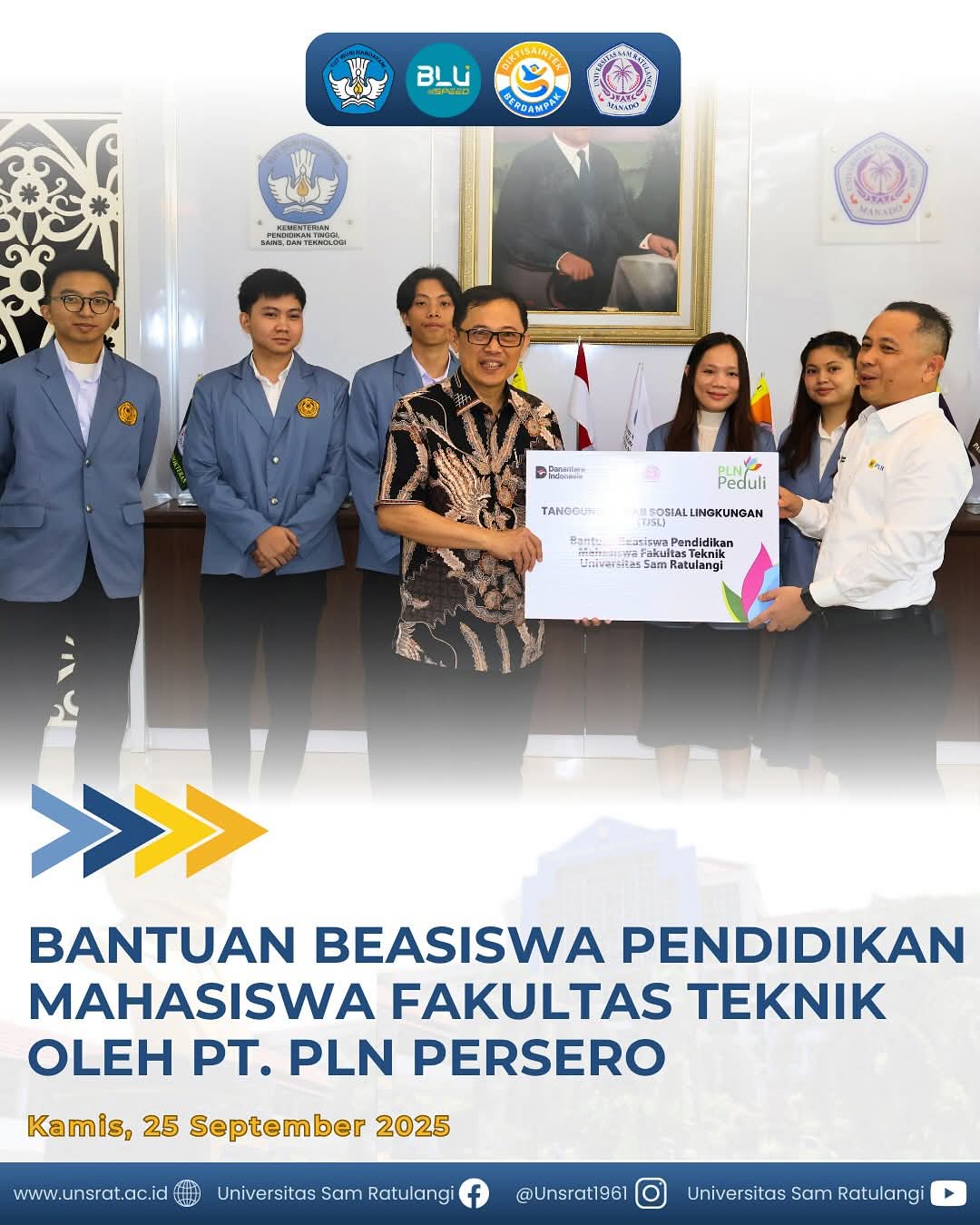 “Selamat kepada mahasiswa Fakultas Teknik yang berhasil menerima Beasiswa Pendidikan PT PLN (Persero). Semoga dukungan ini semakin memacu semangat untuk berkarya, berinovasi, dan menjadi agen perubahan di masa depan,” ujar Rektor Sompie.