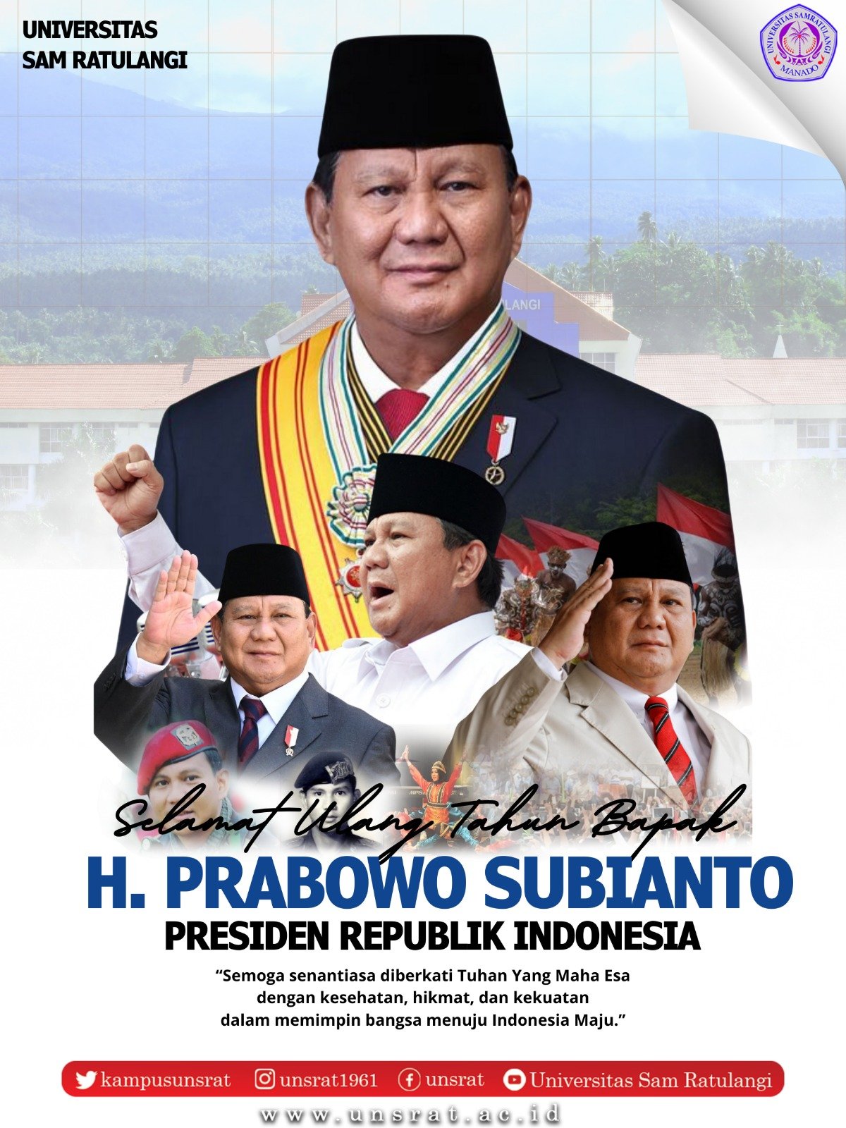 MANADO, sulutexpress.com— Hampir semua beranda media sosial, baik Facebook, Instagram maupun Grup Whatsapp, Kamis 17 Oktober 2025, dibanjiri ucapan Selamat HUT Ke-74 Buat H.Prabowo Subianto, Presiden RI ke-08.Tak terkecuali Rektor Unsrat Prof. Dr. Ir. Oktovian B.A. Sompie M.Eng. IPU.