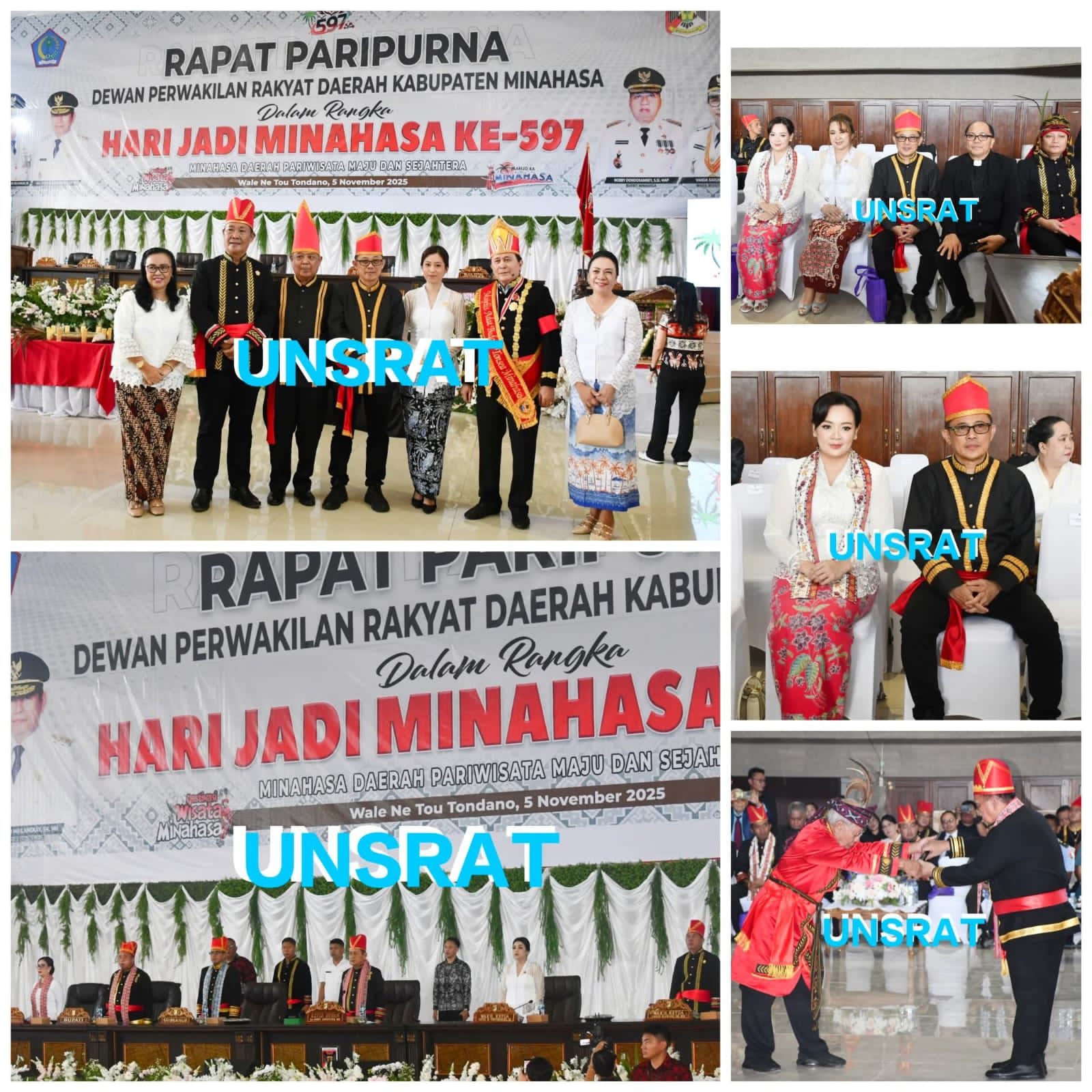 Manado, sulutexpress.com-Rektor Universitas Sam Ratulangi (UNSRAT), Prof. Dr. Ir. Oktovian B.A. Sompie, M.Eng., IPU., ASEAN Eng., menghadiri Rapat Paripurna Dewan Perwakilan Rakyat Daerah (DPRD) Kabupaten Minahasa dalam rangka memperingati Hari Ulang Tahun (HUT) ke-597 Kabupaten Minahasa, bertempat di Gedung Wale Ne Tou Minahasa, Tondano, Rabu (05/11//2025)