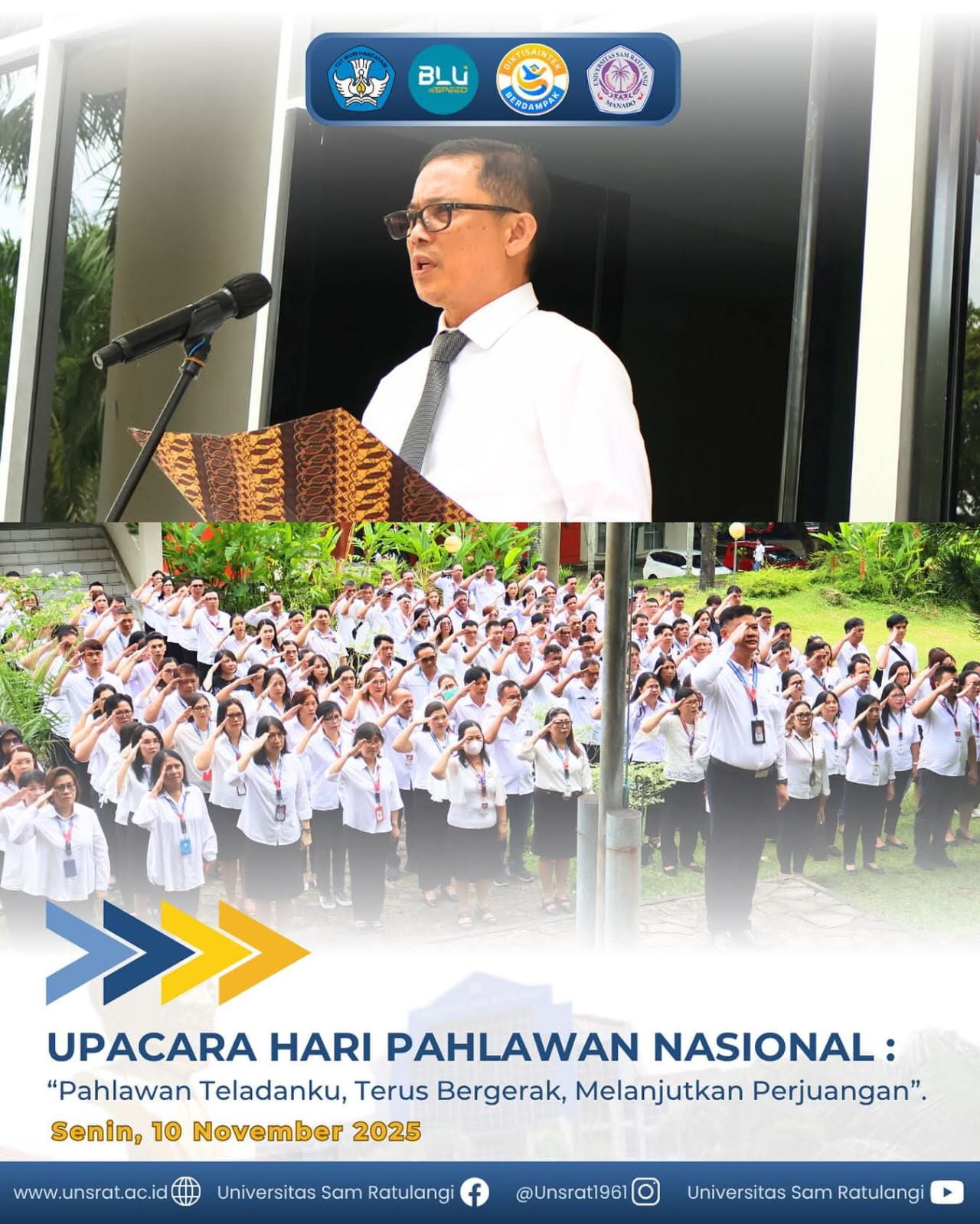 Manado, sulutexpress.com– Universitas Sam Ratulangi (UNSRAT) menggelar Upacara Peringatan Hari Pahlawan Nasional bertempat di halaman Rektorat, Senin (10/11/2025).